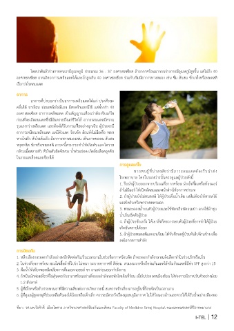 2. ในช่วงที่อากาศร้อน สวมใส่เสื้อผ้าที่โปร่ง ไม่หนา ระบายอากาศดี สีอ่อน สวมหมวกหรือถือร่มกันแดดใช้ครีมกันแดดที่มีค่า SPF สูงกว่า 15