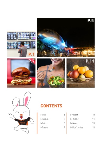 P.5 P.1 P.7 P.11 P.9 CONTENTS I-Tell 1 I-Health 9 I-Focus 3 I-HORO 11 I-Trip 5 I-News 13 I-Taste 7 I-Won’t miss 15
